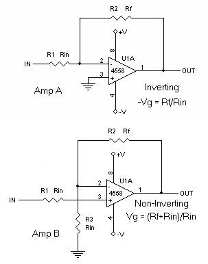 Note:为了动作正常,如果使用单电源供电,非反向放的OP放大器必须与地线关联,如果V-是接地,那+输入端必需有1/2V+的压降,可以电阻分压获得。